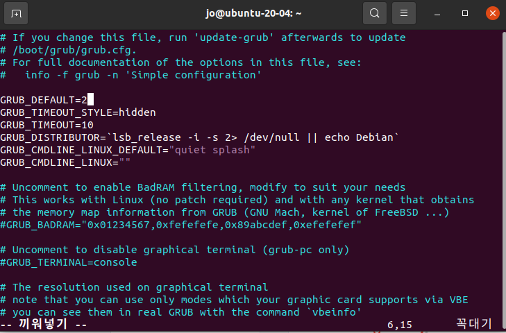 4. sudo update-grub 명령으로 변경사항을 적용한다.