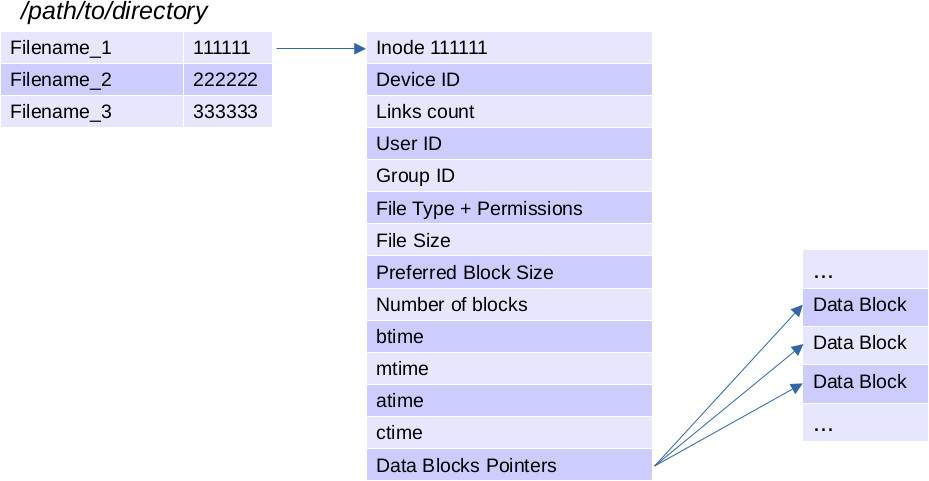 이러한 구조 덕분에 파일 이름을 바꿔도 단지 디렉터리 엔트리의 이름을 바꾸는 것일 뿐 inode는 그대로 유지된다. 또한 하나의 inode를 가리키는 여러 하드링크가 존재할 수 있으며, 파일을 삭제(unlink)하는 행동은 디렉터리 엔트리에서 해당 항목이 제거되는 것일 뿐, 실제로는 inode의 링크 카운터가 0이 되었을 때 커널이 데이터 블록과 inode를 해제한다.