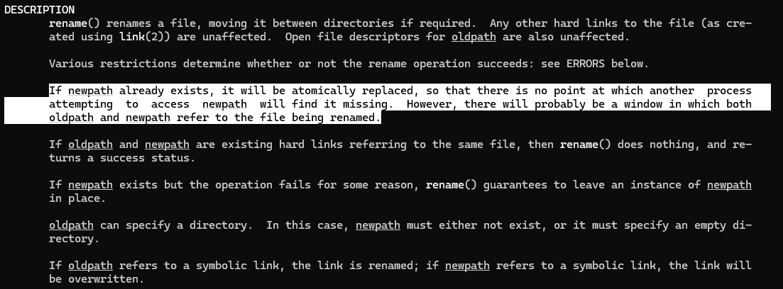 여기서 atomic 하다는 말은 newpath가 이미 존재하고 rename(oldpath, newpath)가 호출되어 newpath 파일이 oldpath 파일로 대체될 때 어느 시점에도 중간 상태(둘 다 존재하거나 둘 다 사라진 상태)가 외부에서 관찰되지 않는다는 뜻이다. 즉, 다른 프로세스가 동시에 파일을 열거나 읽더라도 rename() 호출 전이거나 호출 후 중 하나만 보게 된다.