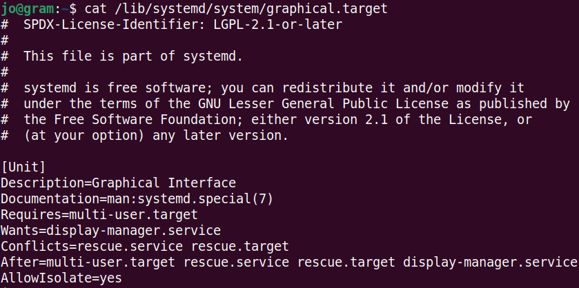 - graphical.target : Requires로 multi-user.target을 필요로 하며, 그래픽 환경을 위한 서비스를 실행한다.