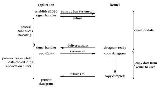 애플리케이션은 미리 시그널 핸들러를 등록하고, 소켓을 signal-driven I/O 모드로 설정해 둔다. 이후 데이터가 준비되면 커널이 SIGIO 시그널을 발생시키며, 애플리케이션은 recv를 호출해 데이터를 유저 버퍼로 복사한다. 즉, I/O 가능 여부는 시그널로 통지받지만, 실제 데이터 복사는 여전히 동기적으로 수행된다.