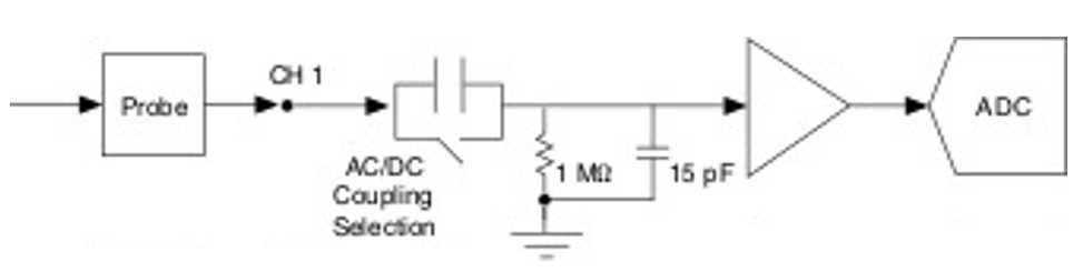 아래 그림은 스코프 입력단의 블록도다. AC 커플링 모드를 선택하면 입력 신호는 직렬로 배치된 커패시터를 통과하게 되는데, 이 커패시터가 스코프 내부의 입력 저항과 결합되서 고역통과 필터(HPF)처럼 동작한다. 이 때문에 DC 성분이 통과 못하는 것 뿐만 아니라 컷오프 주파수 이하의 저주파 성분도 감쇠될 수 있다.