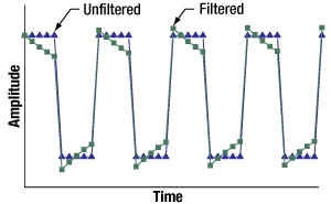 예를 들어, Offset이 0V이고, peek to peek가 -1V ~ 1V이고, Duty 50%인 Pulse 신호가 있다면 이 신호는 직류 성분은 없지만 펄스가 유지되는 구간에 포함된 저주파 성분이 HPF의 영향을 받는다. 따라서 AC 커플링 모드를 선택하면 아래 처럼 신호가 왜곡되어 측정될 수 있다.