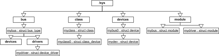 LDM은 sysfs라는 가상 파일 시스템을 통해 사용자 공간(Userspace)에 그 구조를 노출한다. sysfs는 /sys 디렉터리에 마운트되며,커널 내부의 객체인 kobject들과 그들 간의 관계를 파일 시스템 형태로 시각화한 인터페이스라고 볼 수 있다.