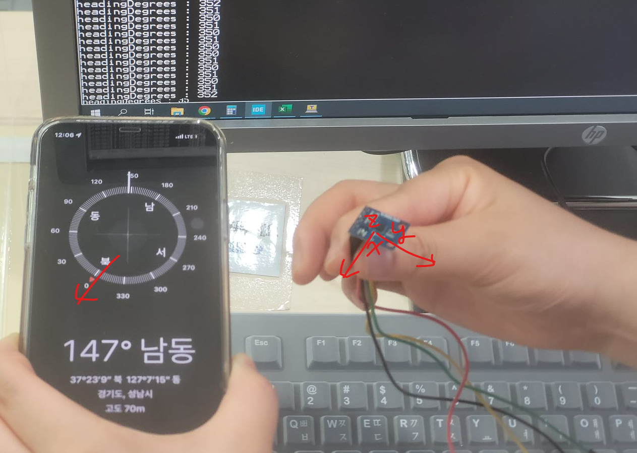지자기센서의 x축 화살표가 그려진 방향을 북쪽으로 향하게 하고 측정했을 때 UART 출력화면을 보면 360~0의 근사치가 나온다.