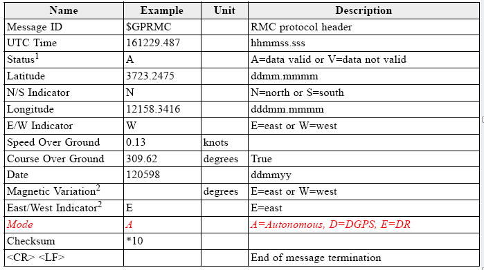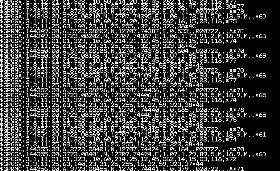 데이터의 형식은 $로 시작해서 GP가 앞에 붙는 NMEA 코드 이름, 콤마로 구분되는 각 필드 데이터, 맨 마지막은 16진수 두자리 *3C 같은 형태의 체크섬이 나오고 CR, LF를 붙여 한줄로 끝난다.