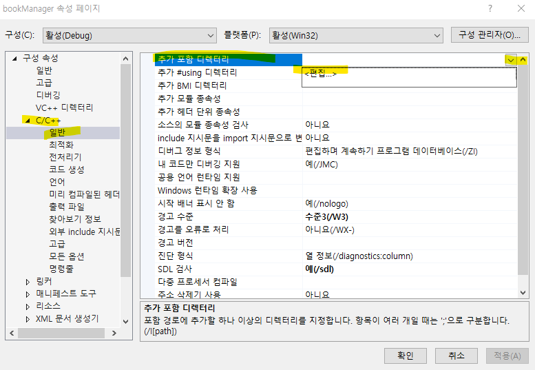 이거 설정할때 위에있는 '구성' 과 '플랫폼'을 잘 확인해야 한다.