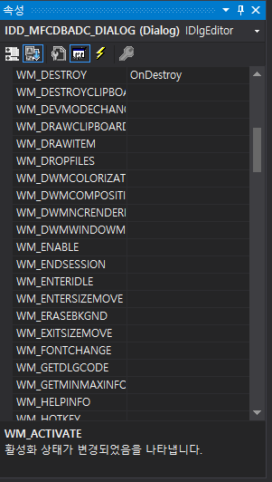 참고로 OnClose() 나 EndDialog() 처럼 메시지 처리 함수를 재정의 하려면 프로젝트 - 클래스 마법사 에서 하는 방법도 있지만 리소스뷰 - 속성 에서 해당 메시지를 찾아서 선택해줘도 된다.