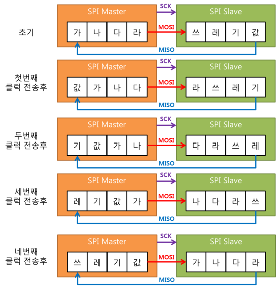 위 그림처럼 Shift Register에 의해 클럭 신호에 맞춰 데이터가 1bit씩 이동하는데 MOSI로 데이터를 출력하는 동시에 MISO로는 데이터가 수신된다. 수신되는 데이터는 상황에 따라 의미가 있는 값일 수도 있고 쓰레기 값일 수도 있다. 쓰레기 값이면 그냥 버리면 되고 슬레이브의 데이터를 읽기 위해서 쓰레기 값으로 밀어내기도 한다.