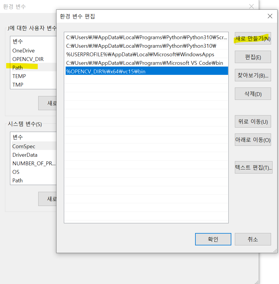 사용자 변수 - PATH 환경변수 더블클릭 - 새로만들기