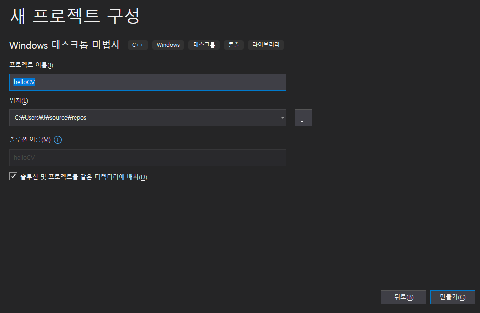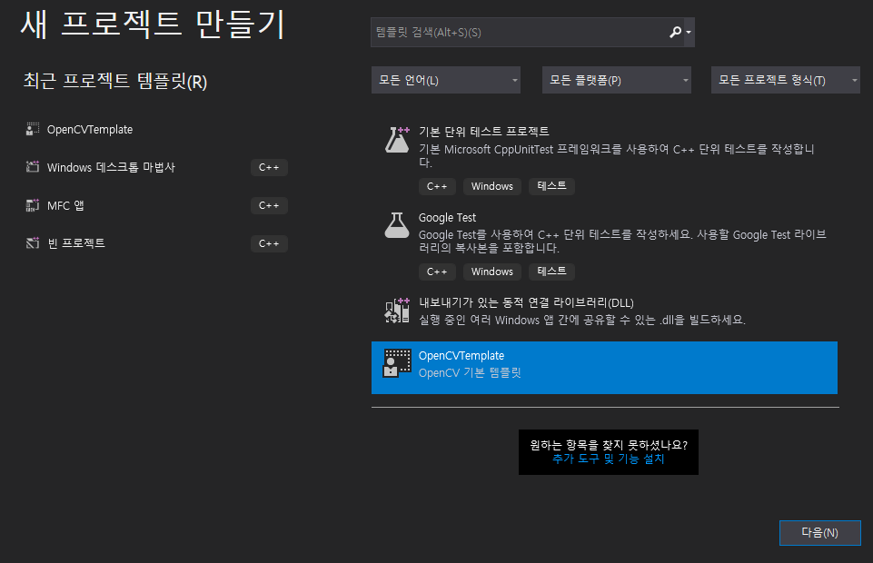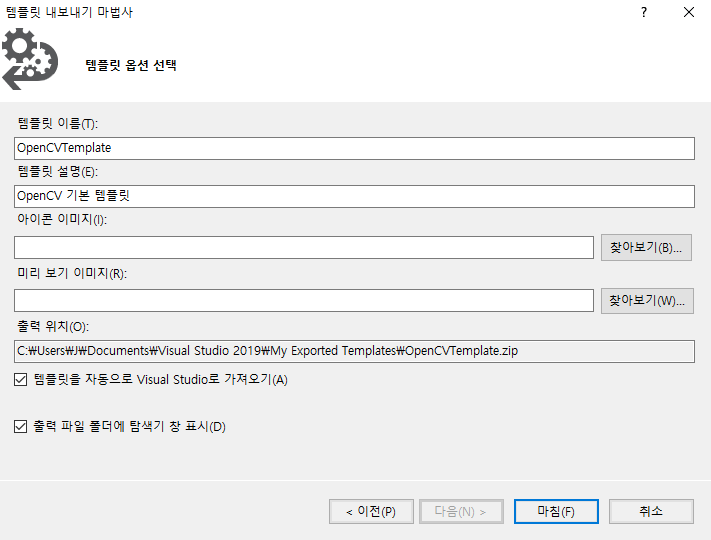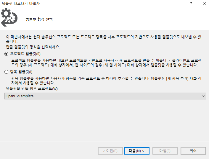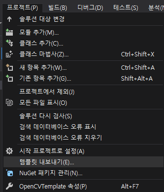 OpenCV의 경우 추가 포함 디렉터리, 추가 라이브러리 디렉터리, 추가 종속성 등을 매 프로젝트마다 설정해줘야 하는데, Visual Studio에서 템플릿 기능을 이용하면 프로젝트 속성이나 기본 소스 코드 등이 미리 설정된 프로젝트를 자동으로 생성할 수 있다.