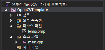 5번의 예제코드와 lenna.bmp 파일도 리소스 파일에 추가해 놓고 프로젝트 명도 OpenCVTemplate으로 수정했다.