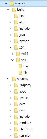 opencv-build-x64-vc15 폴더 내에 Visual Studio 2017/2019 용 OpenCV DLL파일, 유틸리티와 OpenCV LIB 파일이 있다.