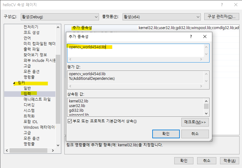링커 - 입력 - 추가 종속성에서 Debug 버전이면 opencv_world[버전]d.lib Release 버전이면 opencv_world[버전].lib 를 넣으면 된다.