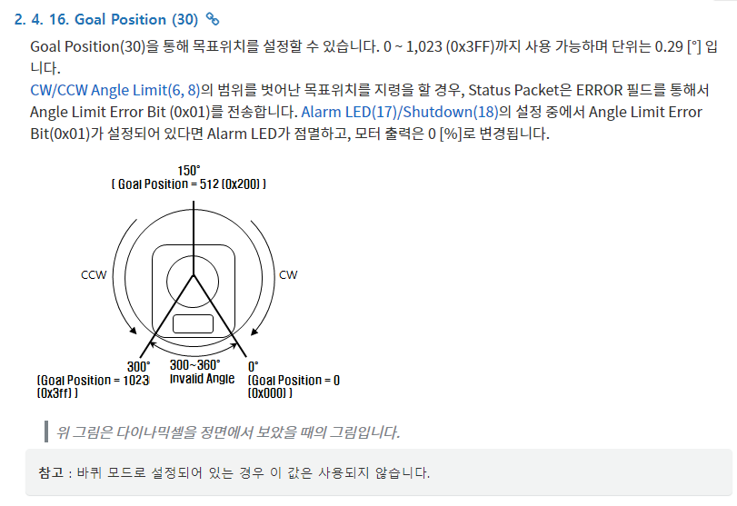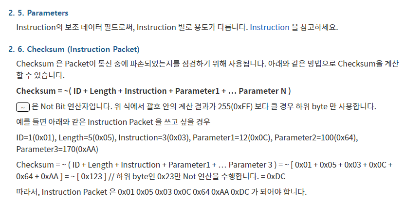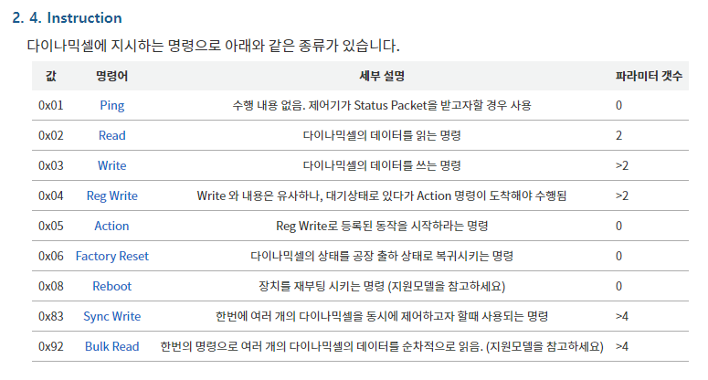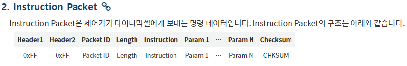 다음 모터를 구동하기 위해서 다이나믹셀 1.0 프로토콜을 이용한다.