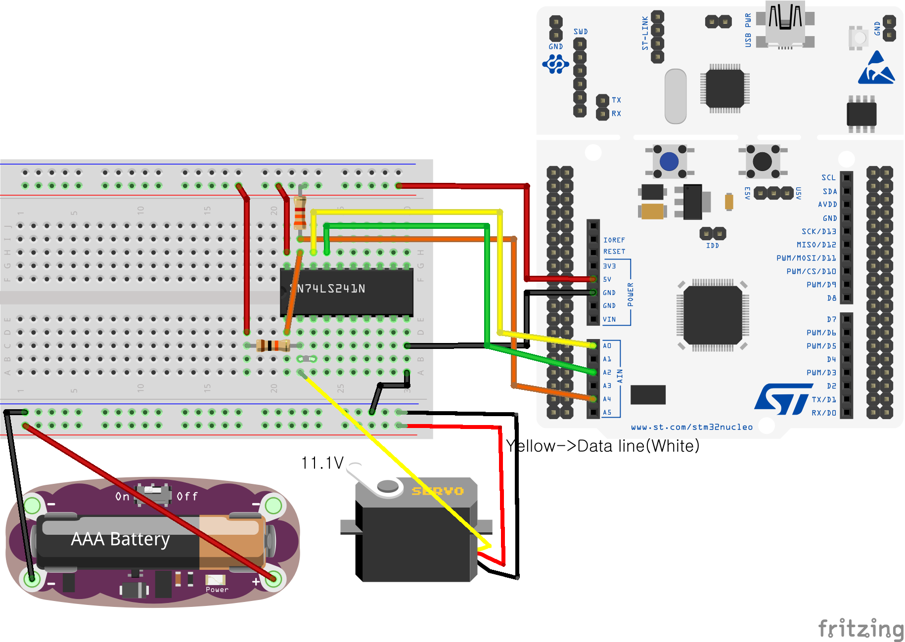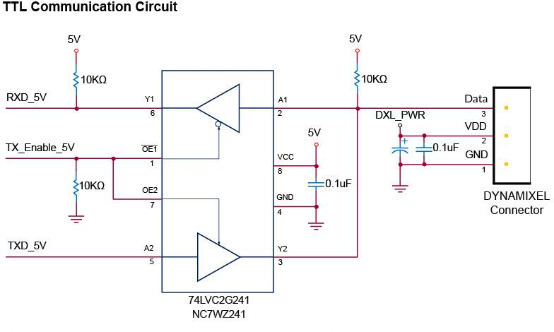그리고 위의 스펙을 보면 모터의 통신방식이 TTL레벨 Half Duplex 시리얼 통신인데 MCU의 RX, TX선과 연결하려면 아래와 같은 통신회로가 필요하다.