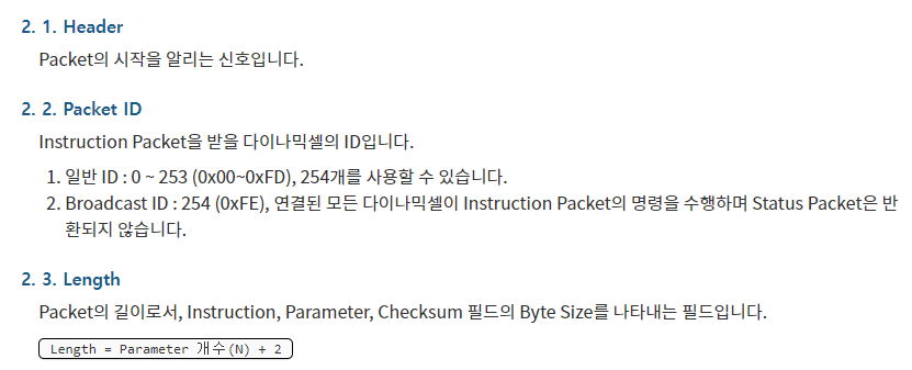 패킷 종류에는 제어기가 다이나믹셀에게 보내는 명령 데이터인 Instruction Packet 과 다이나믹셀이 Controller로부터 받은 명령을 수행한 뒤 그 결과를 Return 하는 데이터인 Status Packet 이 있다.