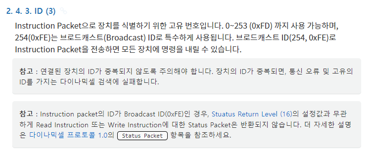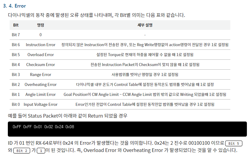 프로토콜 매뉴얼 : https://emanual.robotis.com/docs/kr/dxl/protocol1/#status-packetreturn-packet