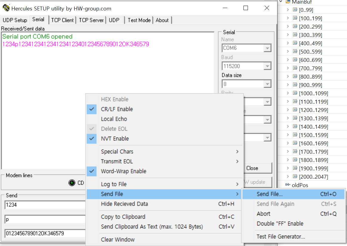 다음 send file 테스트이다. 먼저 버퍼의 사이즈를 키우고 다시 디버그 한다.