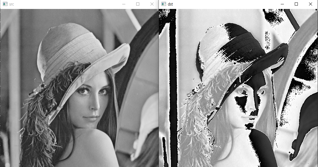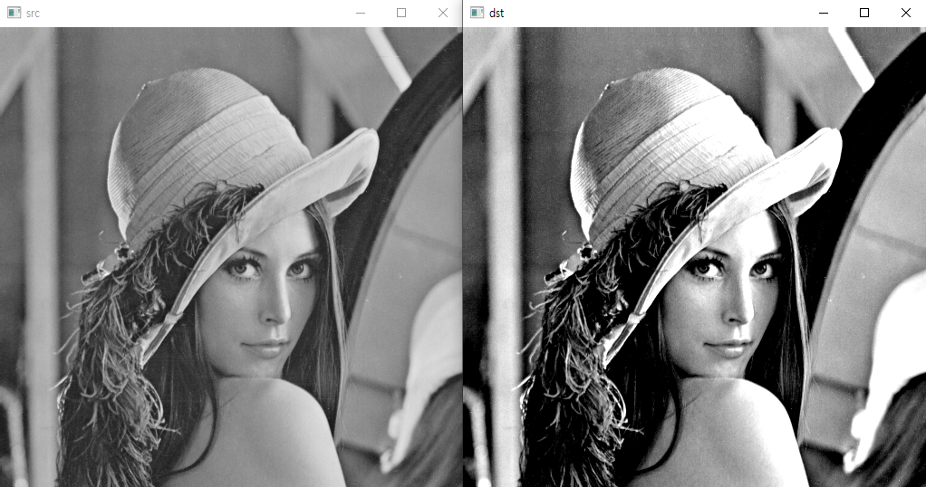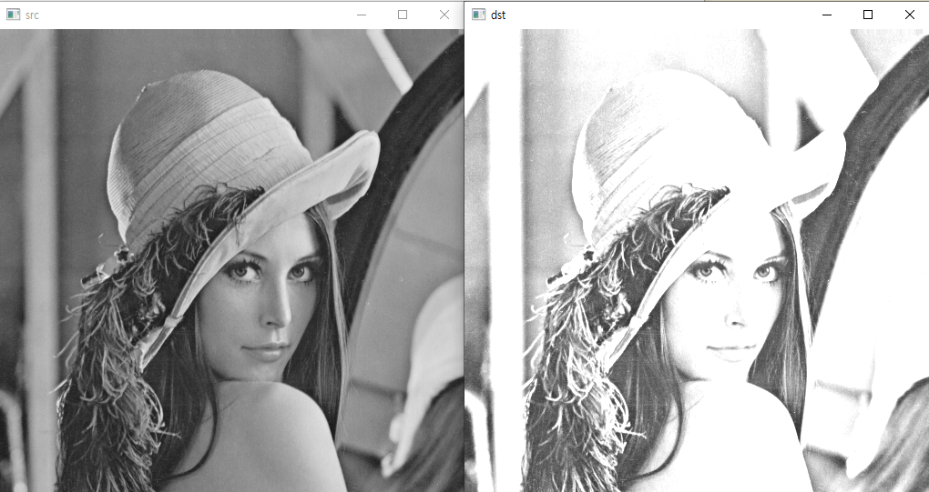 // 입력 영상의 픽셀 값이 128보다 크면 더욱 밝게 만들고, 128보다 작으면 픽셀 값을 더 작게 만드는 방식
