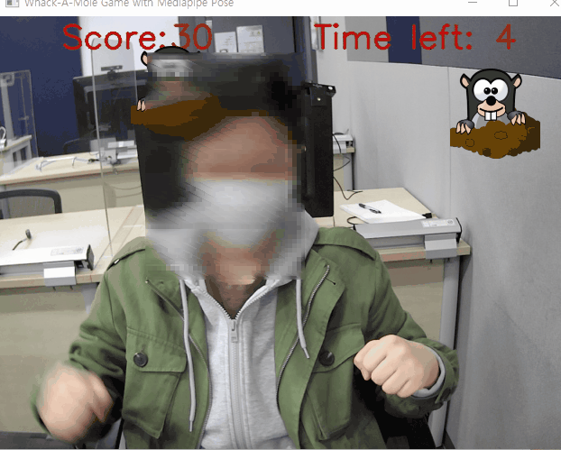 Mediapipe Pose를 통해 인식된 손과 발의 좌표가 랜덤으로 출력되는 두더지 이미지 좌표범위와 일치할때 두더지를 잡을 수 있습니다.