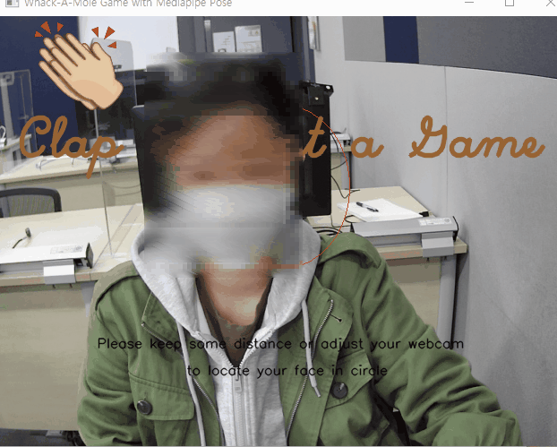 처음 실행 시 화면에 Clap to start a game이라고 표시했다. 사용자가 적당한 거리를 두고 시작할 수 있도록 화면에 빨간 타원을 그리고 원 안에 얼굴을 위치시키라고 안내문을 적었다. 박수를치면 30초가 주어지고 게임 시작.