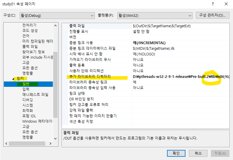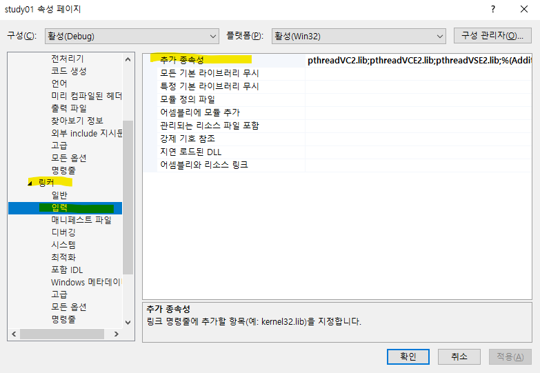 3.3. 링커 - 입력 - 추가 종속성에 lib 폴더 안에 있는 파일들을 추가한다.