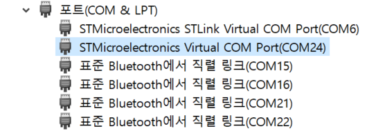 보드에 소스코드를 다운로드하면 바로 COM port가 추가로 잡힌다.