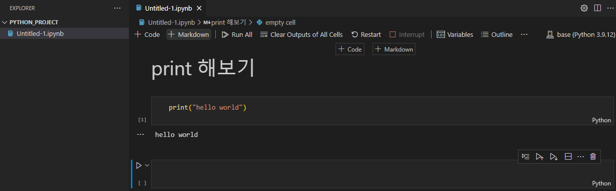 Ctrl + Shift + P 를 눌러 명령 팔레트를 켜고 jupyter를 쳐서 Create New Jypyter Notebook 선택