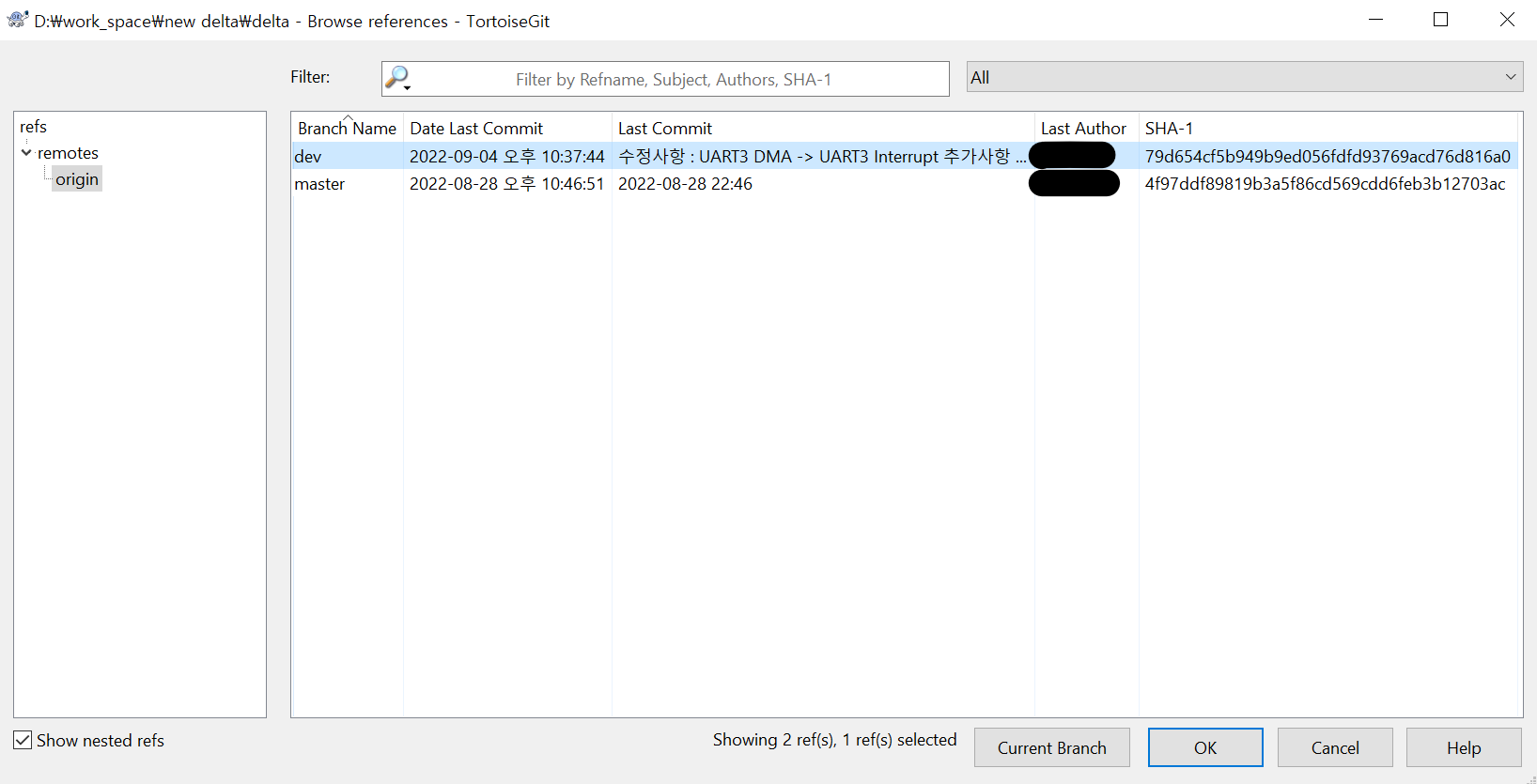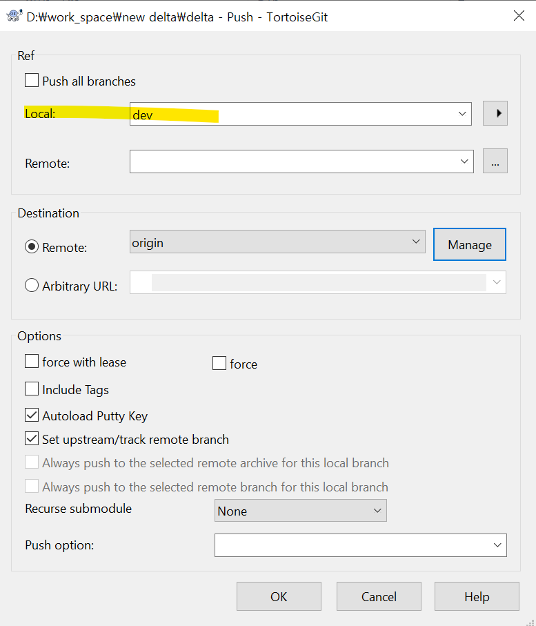 원격에 dev 브랜치가 새로 생성된 것을 알 수 있다.