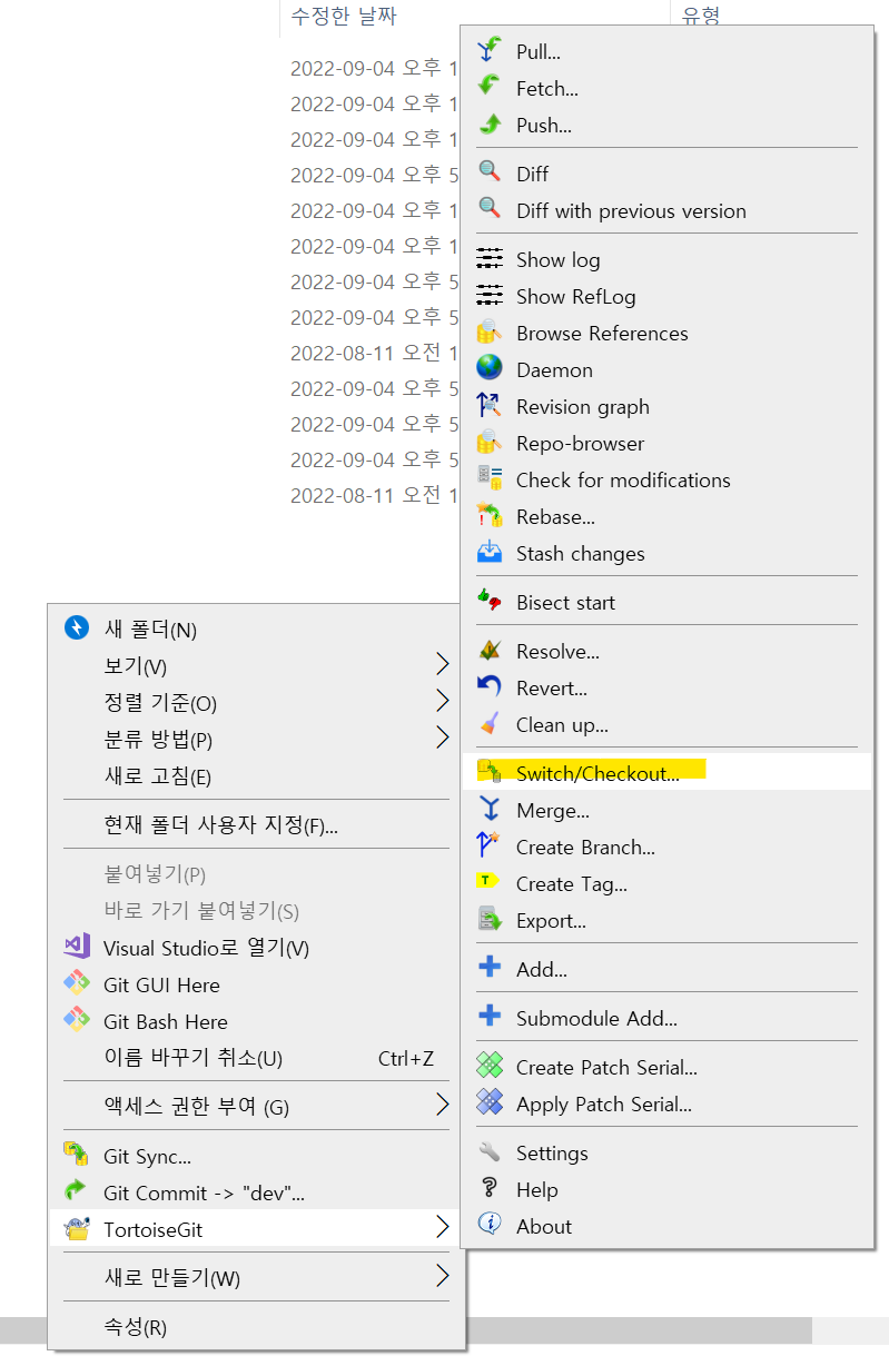 이후 브랜치를 변경할 때는 Switch/Checkout 을 클릭하면 가능하다.