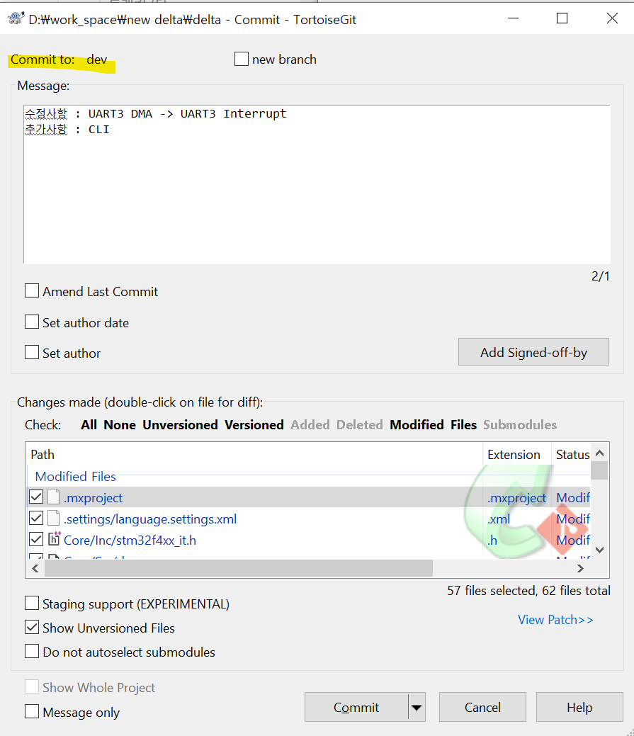 3. 로컬 저장소에서 새 브랜치로 변경된 상태이며 이대로 커밋한다.
