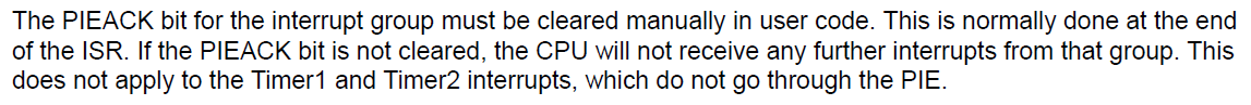그리고 매뉴얼 설명에 나와있듯이 ISR 끝부분에서 Interrupt_clearACKGroup(INTERRUPT_ACK_GROUPx); 함수를 호출해서 PIEACK bit 를 clear 해주어야 한다.