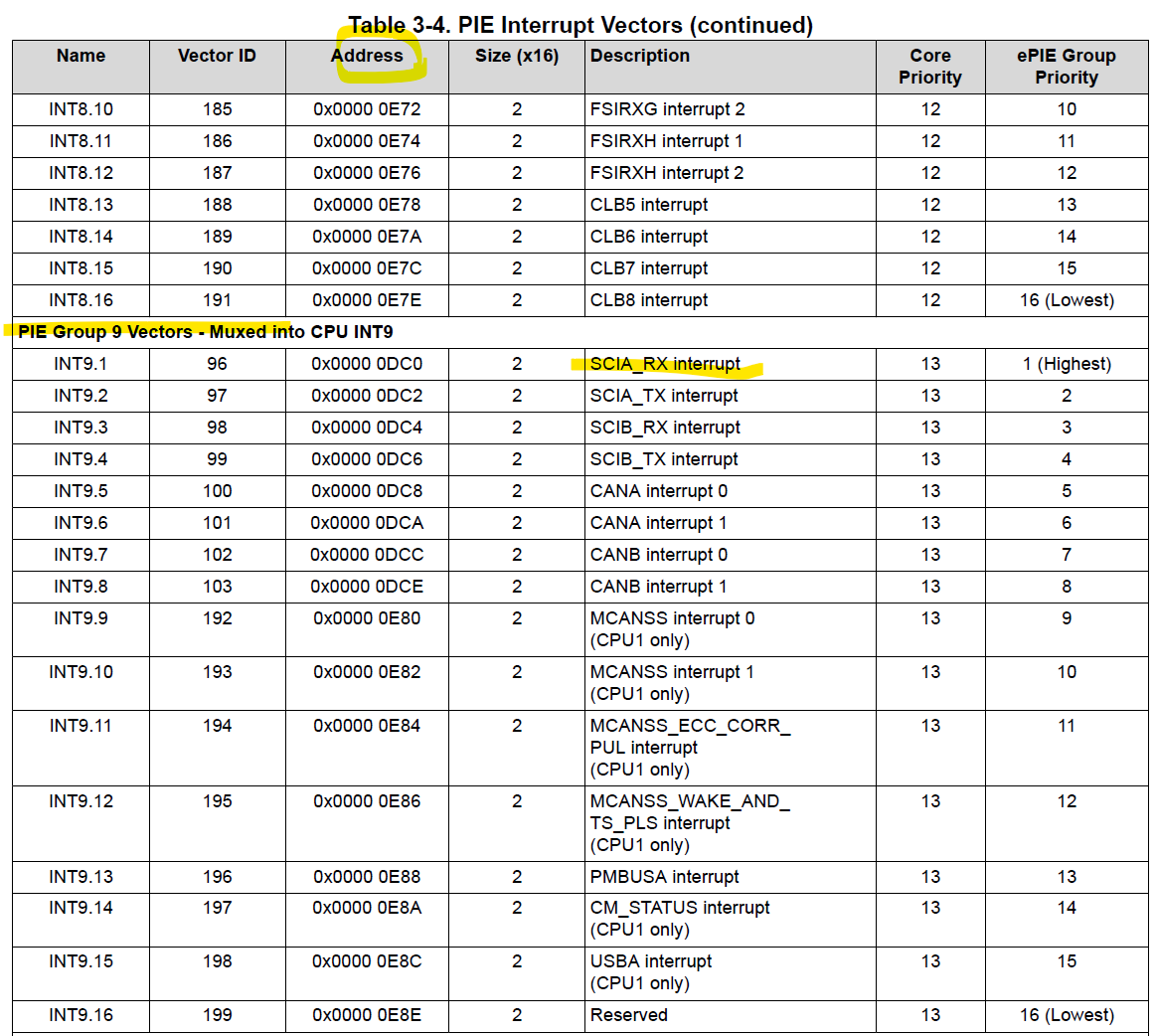 주소를 지정하는 일은 위 코드처럼 Interrupt_register(INT_SCIA_RX, sciaRXFIFOISR); 함수를 사용하면 되고 첫번째 매개변수가 hw_ints.h 에 정의된 PIE Interrupt Numbers 두번째 매개변수가 내가 만든 핸들러 함수명이다.