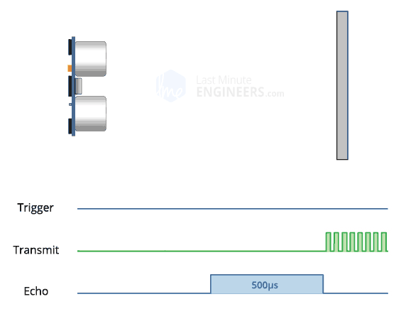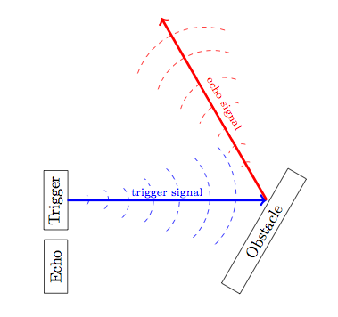 초음파는 인간의 가청 한계를 넘는 고주파음이다. Trig핀으로 최소 10μS이상의 high(5V) 펄스가 들어오면 Transmitter 에서 40KHz초음파를 8회 발사한다. echo핀은 high 상태가 되고 물체를 맞고 반사된 초음파를 reciever 가 수신하면 다시 echo핀은 low상태가 된다.(앞에 물체가 없어 발사된 후 38ms동안 수신이 없으면 echo 핀이 다시 low 상태가 됨.) 음속은 340m/s 니까 echo핀의 high pulse duration을 아두이노의 pulsein 함수로 재고 거리=속력*시간 공식으로 계산하면 물체와의 거리를 계산할 수 있다.
