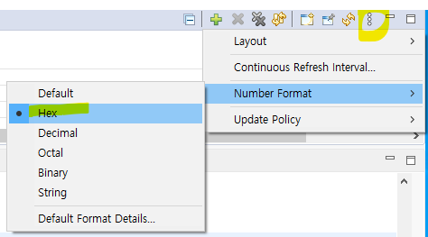 Expression에서 점 세개를 누르고 Number Format의 Hex를 선택할 수 있다.