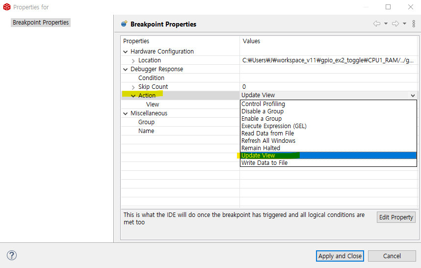 Action의 기본값인 Remain Halted 대신에 Update View 또는 Refresh All Windows 선택