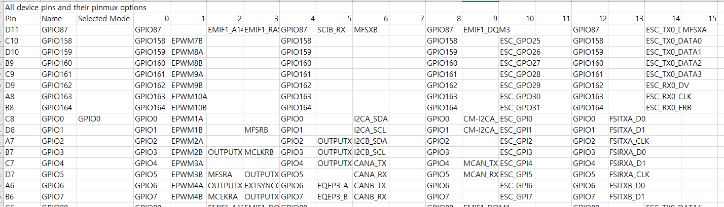 열어보면 아래와 같이 pinMux 세팅을 한눈에 볼수 있다. 해당 핀으로 사용가능한 기능, 현재 사용중인 모드 등을 볼 수 있고 엑셀의 필터기능을 사용하면 더 유용하게 쓸 수 있다.