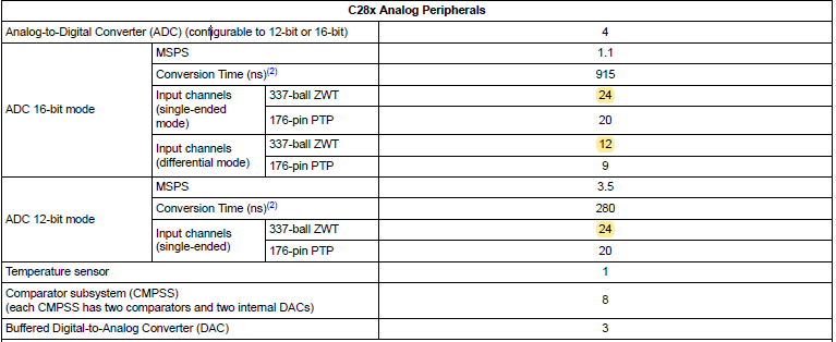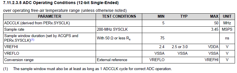 기준 전압은 VREFHI 핀, VREFLO 핀인데 일반적인 경우 VREFHI는 VDDA(3.3v) VREFLO는 VSSA(GND)이다. 이 내용은 데이터시트에서 찾을 수 있다. 근데 아마 이전 28x 코어 DSP 시리즈는 기본 입력범위가 0-3V였었나보다.