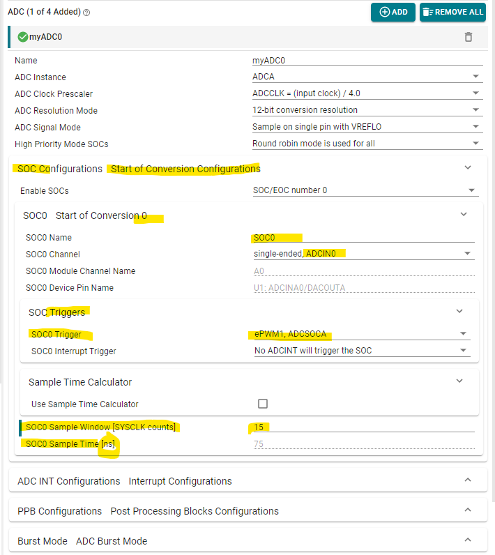 ADC_setupSOC(myADC0_BASE, ADC_SOC_NUMBER0, ADC_TRIGGER_EPWM1_SOCA, ADC_CH_ADCIN0, 15U);