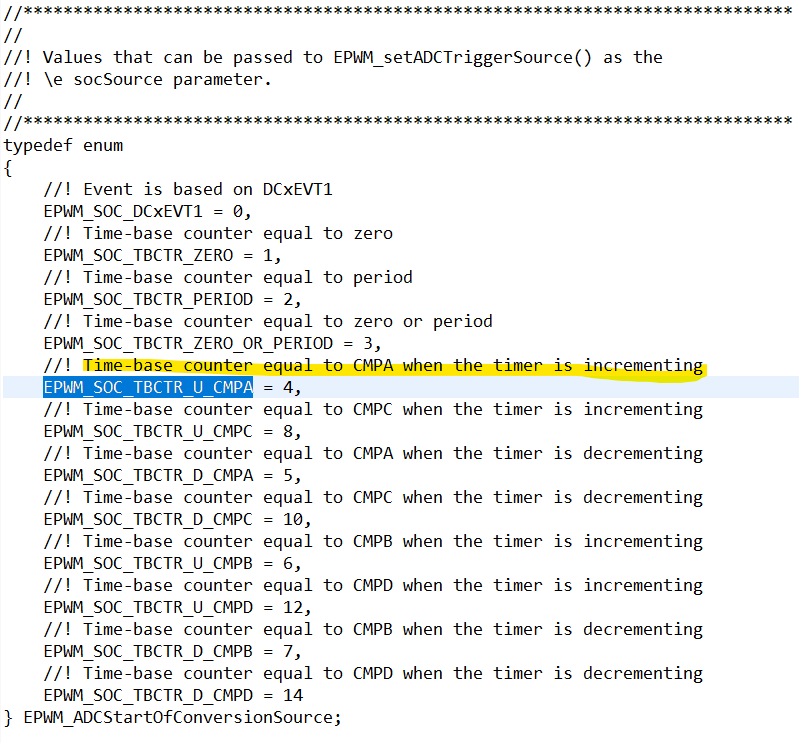initEPWM() 함수를 보면 먼저 EPWM_setADCTriggerSource() 함수에서 adcSOCType 은 EPWM_SOC_A 로 하고 socSource 를 타이머가 증가할 때 CMPA와 동일한 순간으로 설정하고 있다.