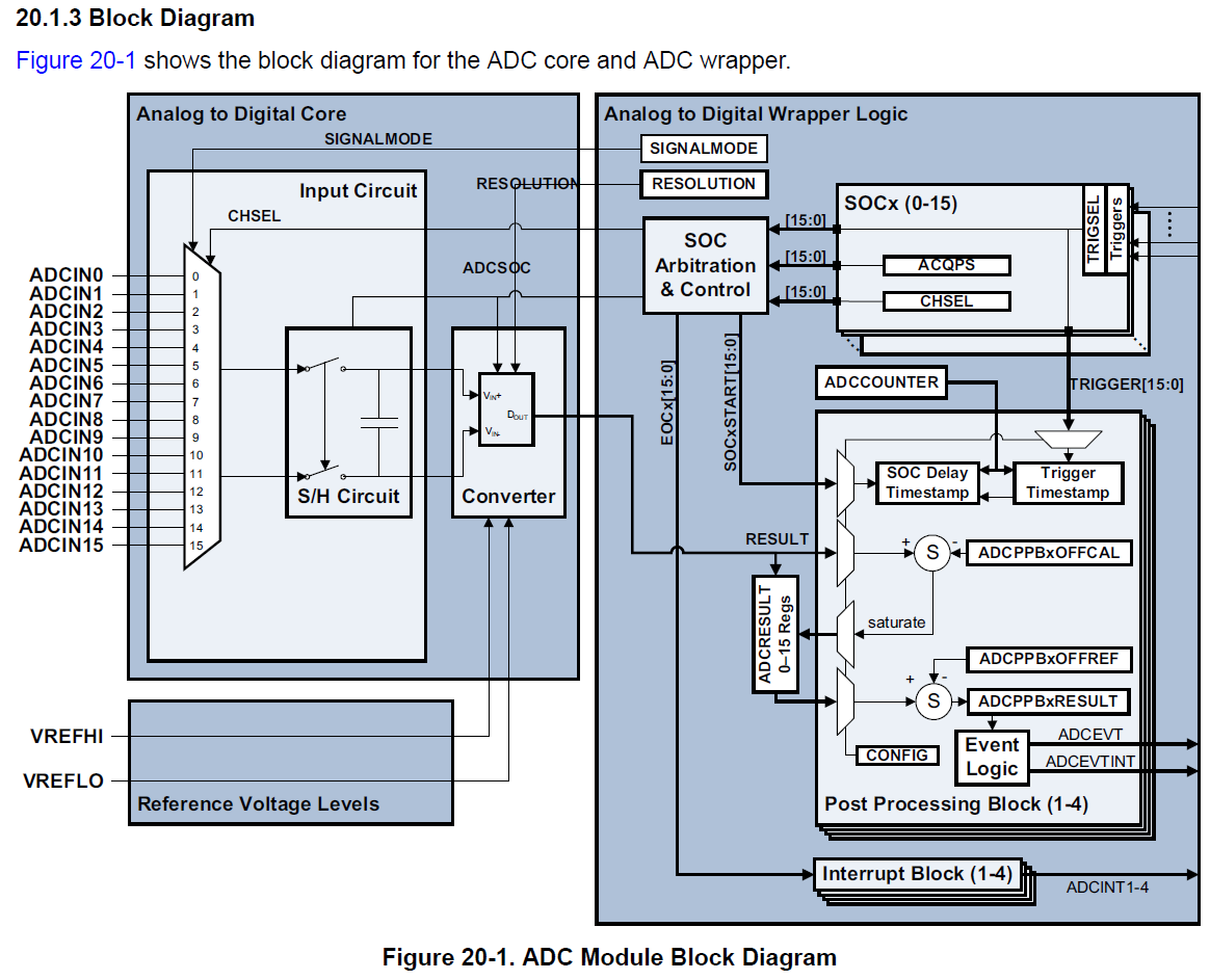 아래 ADC 모듈의 블락 다이어그램을 보면 Itnerrupt Block이 4개(1~4)있고, EOCx[15:0](End of Conversion)를 ADCINTx의 Trigger로 사용할 수 있다.