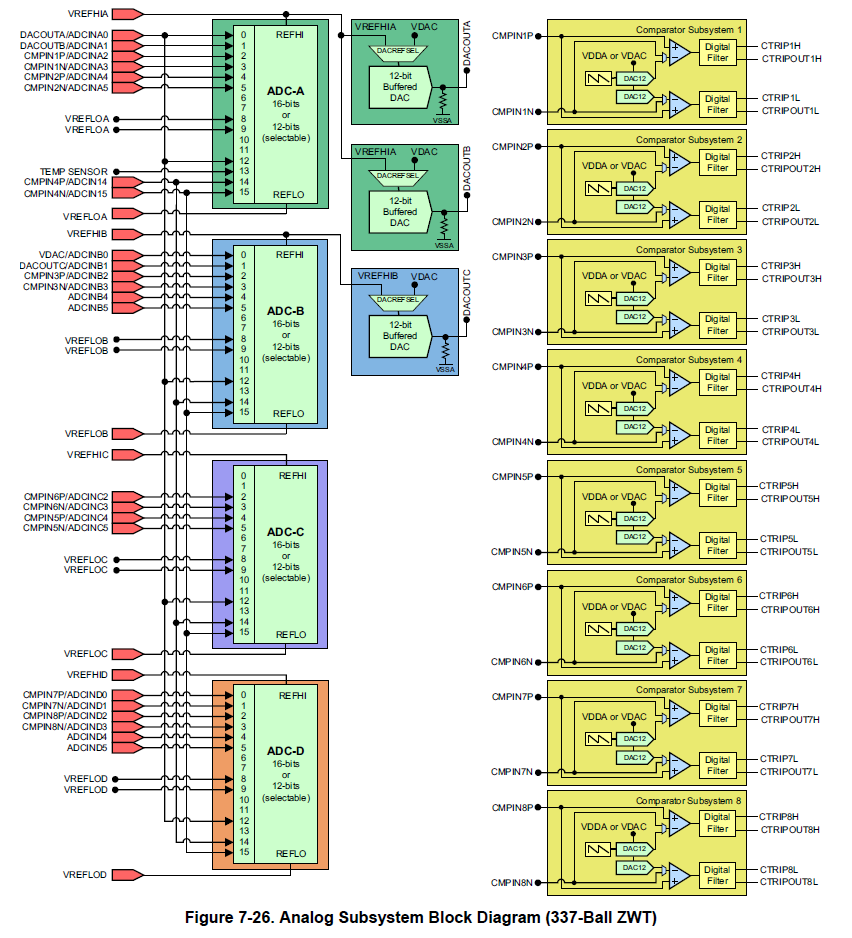 TMS320F28388D 는 4개의 ADC 모듈이 있고 물리적인 ADC핀이 24개 있다. 그중 ADCIN14/ADCIN15 핀은 ADC-A/B/C/D와 모두 연결되어 있어서 필요에 의해 사용할 수 있다.