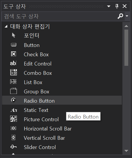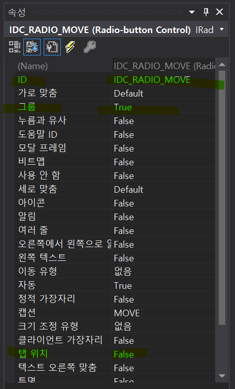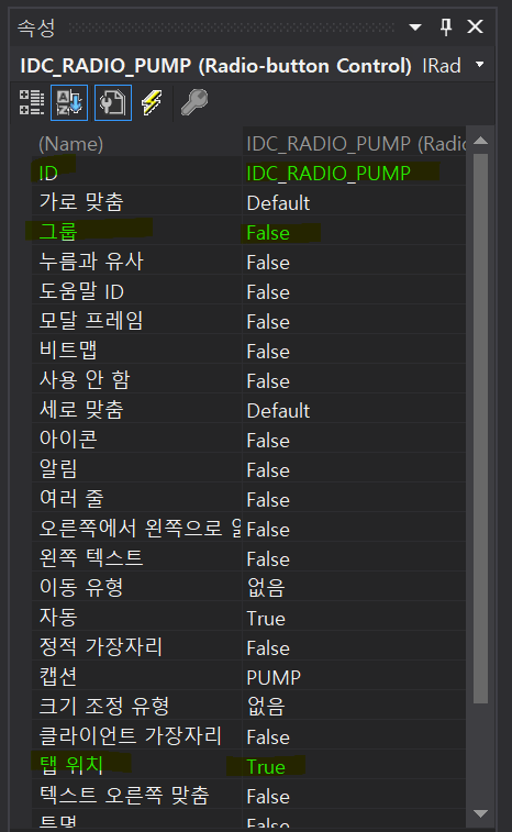 이렇게 한 그룹으로 묶이면 클래스 마법사에서 확인해봤을 때 그룹의 첫번째 라디오 버튼만 뜨는 것을 확인할 수 있다.