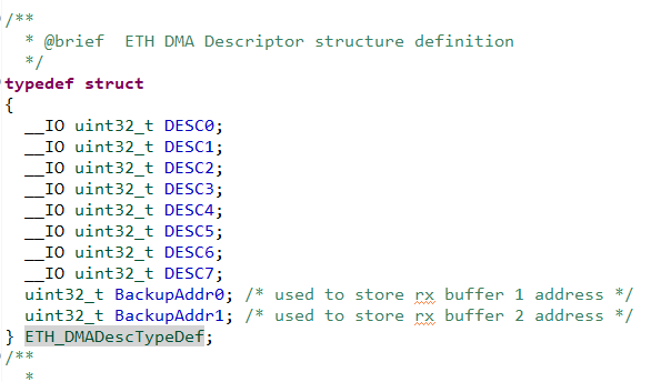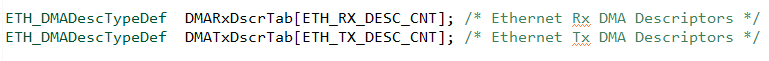 STM32 이더넷 블락은 DMA 컨트롤러가 CPU 개입 없이 소스에서 목적지로 데이터를 효과적으로 이동하기 위해서 DMA Descriptor 라는 자료구조를 사용하는데 이 구조체는 stm32f4xx_hal_eth.c 파일에 정의되고 ethernetif.c 파일에 선언되어 있다.