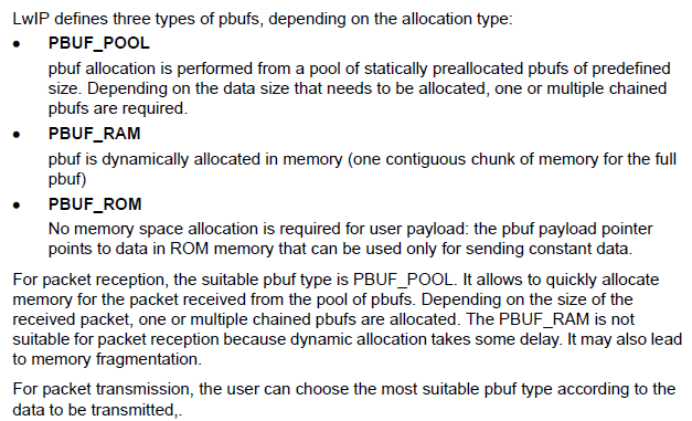 PBUF_RAM 은 패킷 수신에는 딜레이와 메모리 단편화를 일으킬 수 있어 적합하지 않지만, 요청시 필요한 만큼 동적 메모리(heap)에 pbuf를 할당하는 타입으로 송신에 보다 적합하게 사용될 수 있다.