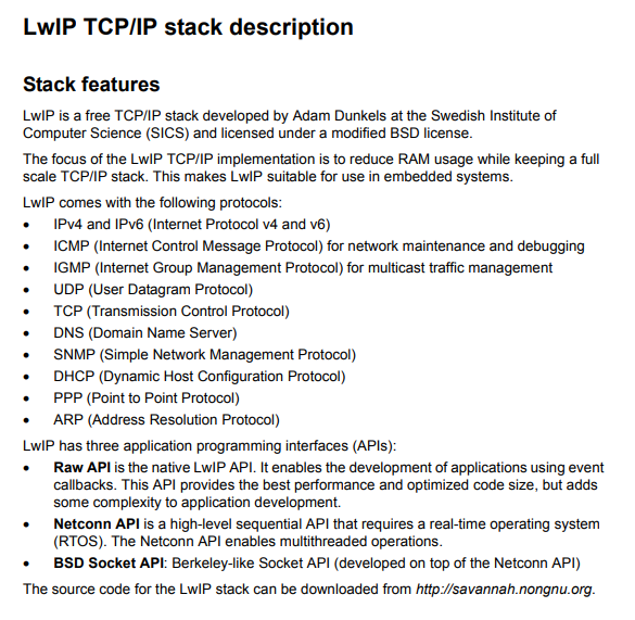 LwIP TCP/IP stack에서 지원하는 프로토콜 : IPv4, IPv6, ICMP, IGMP, UDP, TCP, DNS, SNMP, DHCP, PPP, ARP