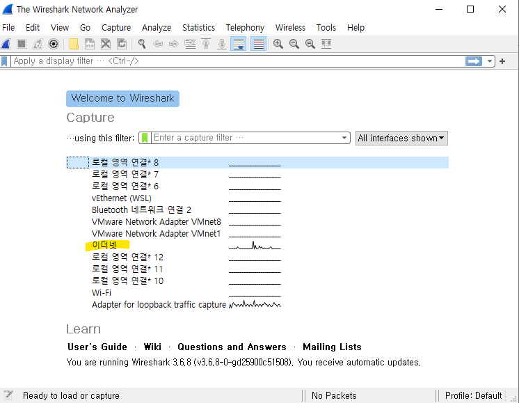 들어가면 뭔가 아주 빠르게 움직이고 있다. 그래서 display filter 기능을 잘 쓰는게 필요하다.