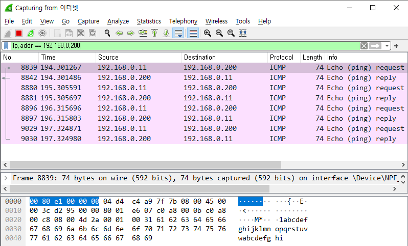 먼저 필터를 ip.addr == 192.168.0.200 로 해서 해당되는 ip 주소만 뜨게 필터링 해본다.