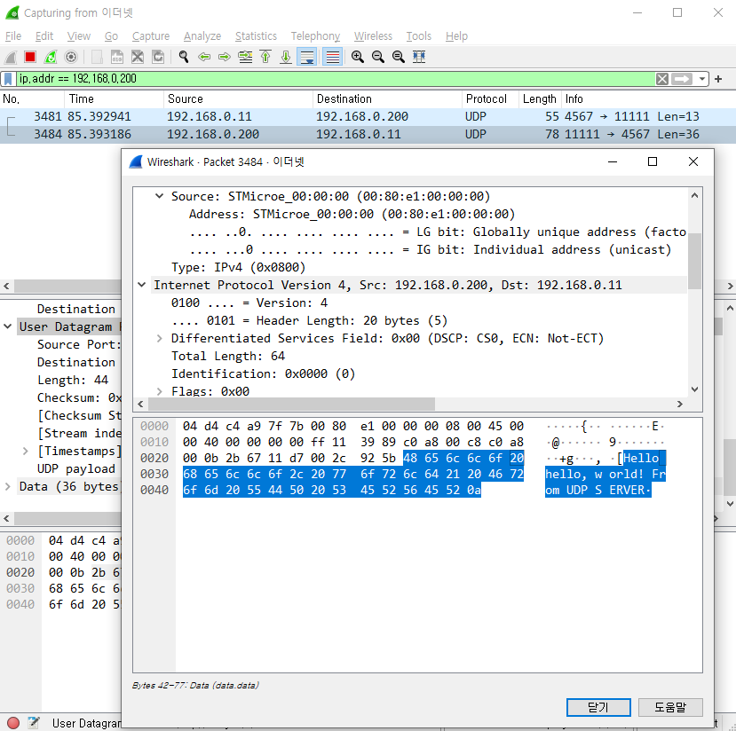 아래와 같이 Protocol UDP로 송수신된 패킷이 보이고 패킷을 의미있는 byte 단위로 뜯어서 볼 수 있다.